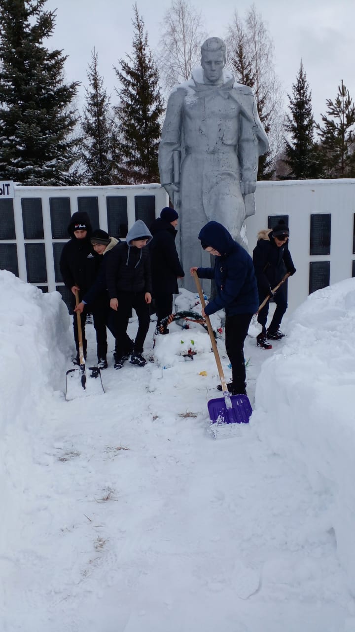 Юнармейцы МБОУ "СОШ им. М. Фархутдинова с. Мичуринск" в рамках месячника военно-патриотического воспитания расчистили от снега территорию мемориала ВОВ и возложили цветы участникам ВОВ.