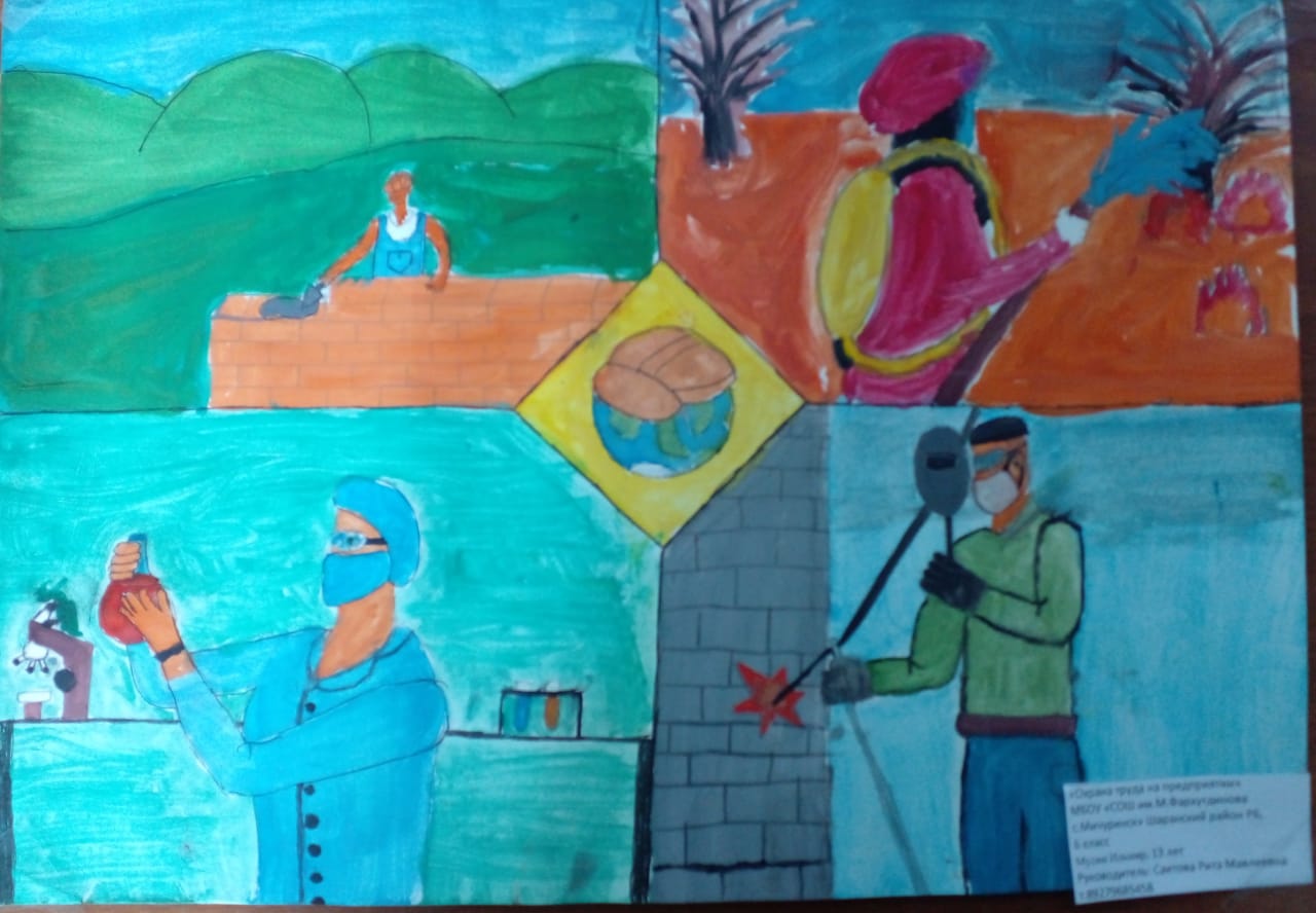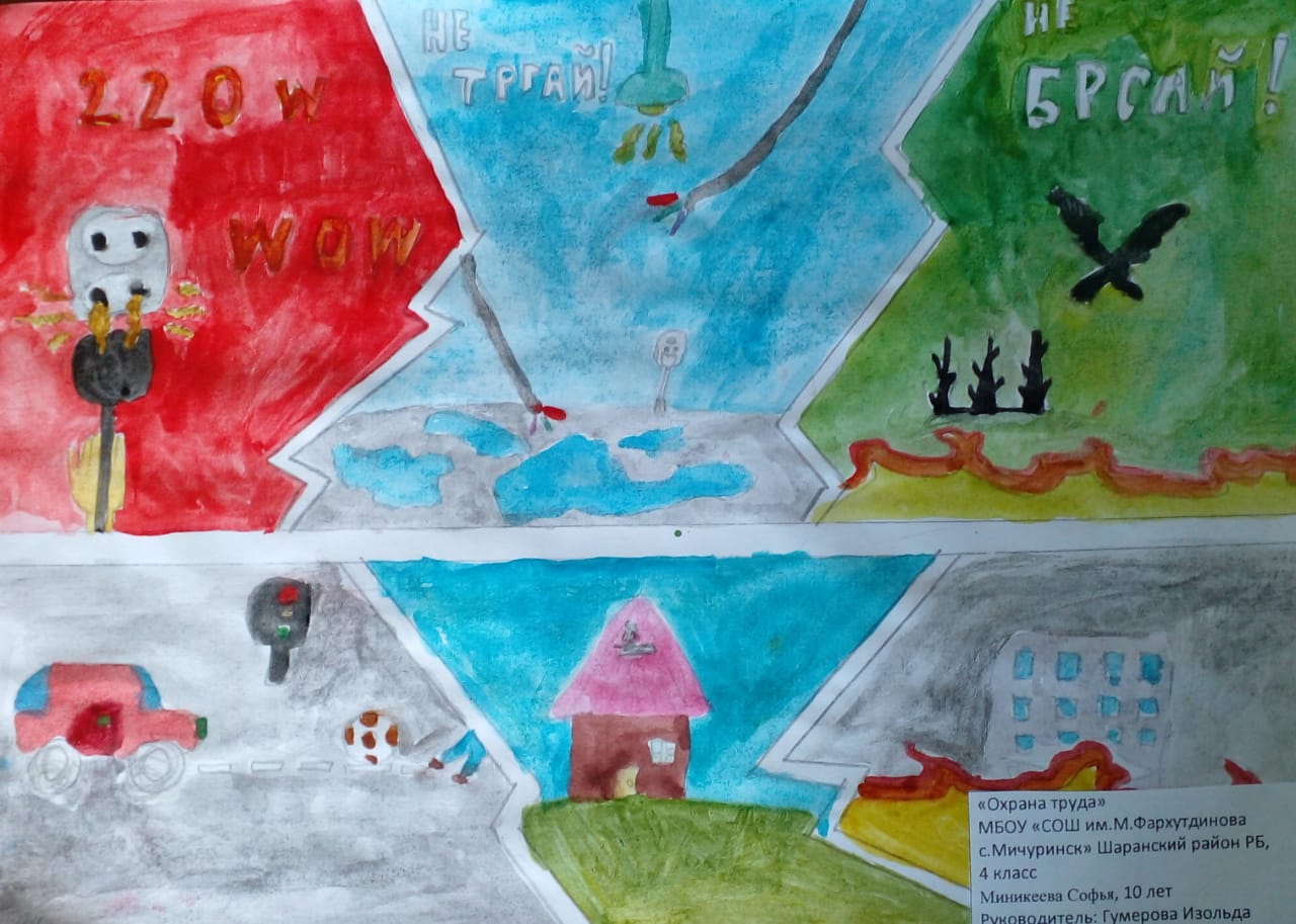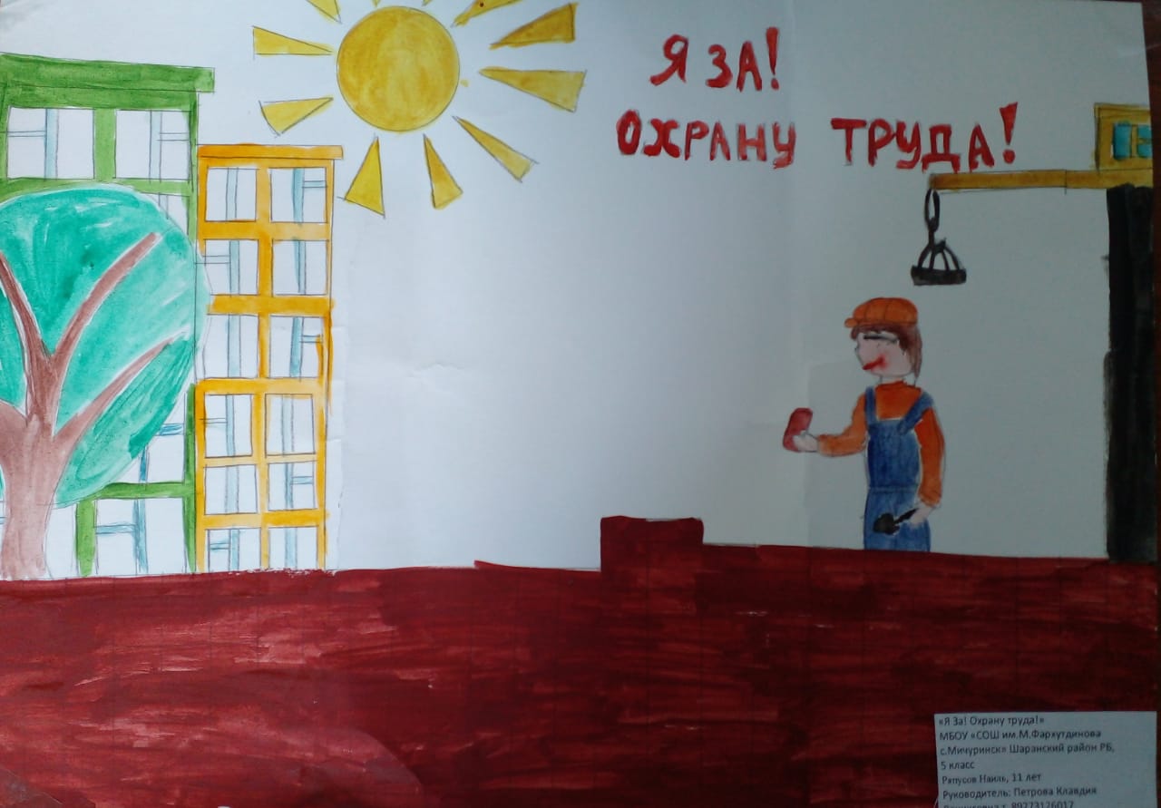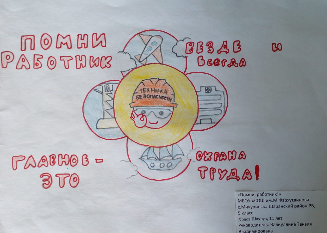 В целях привлечения внимания общественности к проблемам охраны труда 28 апреля обозначается как Всемирный день охраны труда. С целью информирования коллектива в МБОУ «СОШ им.М.Фархутдинова с.Мичуринск» был обновлен уголок по охране труда: размещена информация по профилактике коронавирусной инфекции, а также памятки-листовки размещены в учебных классах, столовой, на входе в здание учреждения образования. Классными руководителями 5-10 классов проведены тематические классные часы «Всемирный день охраны труда». В фойе школы организованна выставка рисунков учащихся школы.