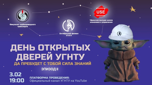 ФГБОУ ВО «Уфимский государственный нефтяной технический университет» выражает Вам благодарность за содействие и информационную поддержку, оказанную при проведении профориентационного онлайнмероприятия 9-го декабря 2021 года. С учетом имеющихся ограничений на проведение массовых мероприятий в очном формате, проведение мероприятий формата Дня открытых дверей в ближайшее время также предполагается целесообразным проводить с использованием дистанционных технологий. 3-го февраля 2022 года состоится проведение онлайн-мероприятия «День открытых дверей: Эпизод II», в рамках которого УГНТУ продолжит представлять абитуриентам и их родителям подробную информацию об университете, направлениях подготовки высшего образования и реализуемых специальностях среднего профессионального образования. Профориентационную эстафету подхватят следующие факультеты и институты УГНТУ, дав возможность абитуриентам познакомиться с университетом. Абитуриенты получат исчерпывающую информацию о правилах приема в УГНТУ в 2022 году, включая перечень мероприятий (олимпиад и конкурсов), в том числе проводимых университетом, позволяющих получить дополнительные баллы к сумме баллов ЕГЭ. Просим Вас оказать информационное содействие в привлечении учащихся 9-11 классов общеобразовательных организаций и профессиональных образовательных организаций Республики Башкортостан, а также их родителей к регистрации и дистанционному участию в мероприятии. Мероприятие «День открытых дверей УГНТУ: Эпизод II» состоится 3 февраля 2022 г., начало мероприятия в 19:00, платформа проведения – официальный канал УГНТУ на видеохостинге «YouTube». Программа мероприятия (в том числе ссылка для регистрации) прилагается.